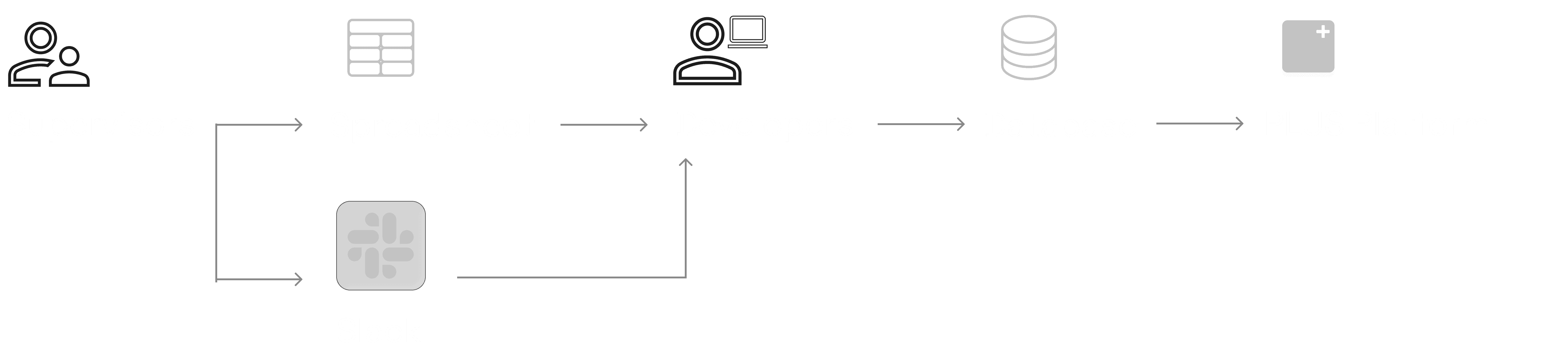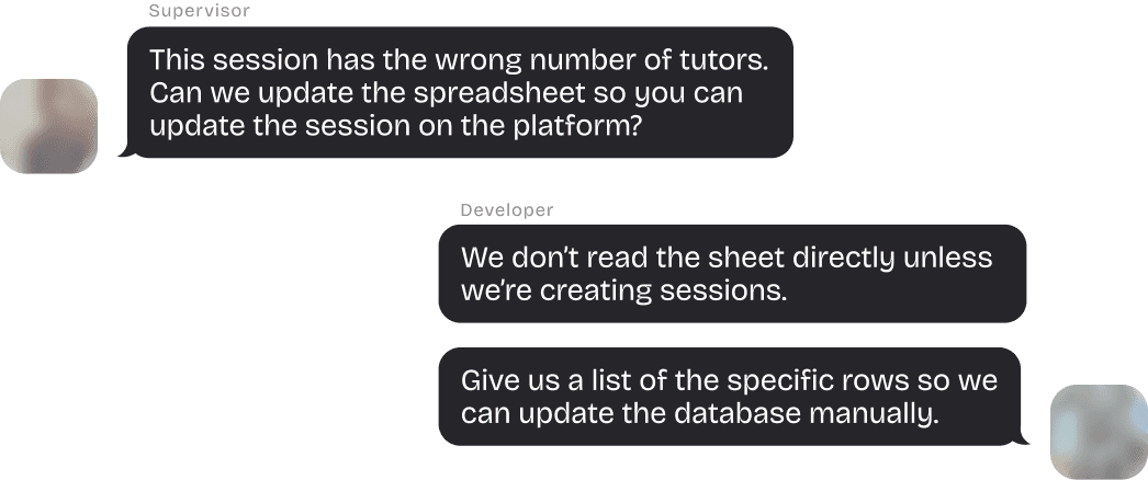 Supervisors create, update, and cancel sessions through spreadsheets and Slack, while developers manually apply those changes to the database.